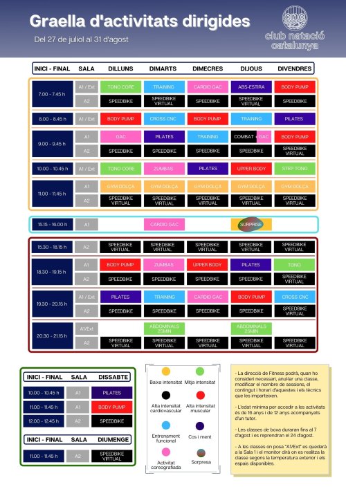 I, com que iniciem ja l’horari d’activitats dirigides d’estiu, aquestes es veuen modificades. Consulteu la nova graella o descarrega-la fent clic a aquí: