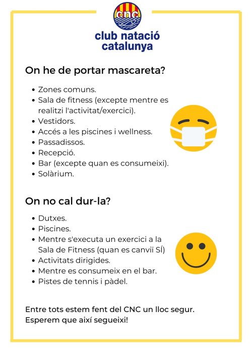 Com a conseqüència dels rebrots de la Covid 19 que estan havent-hi en tot el territori català, concretament a l'àrea metropolitana de Barcelona, el CN Catalunya està sent encara més exigent en les mesures de seguretat i prevenció per tal de fer que les nostres instal·lacions segueixin sent un espai sense Covid19. És per això que enfortim els següents aspectes: